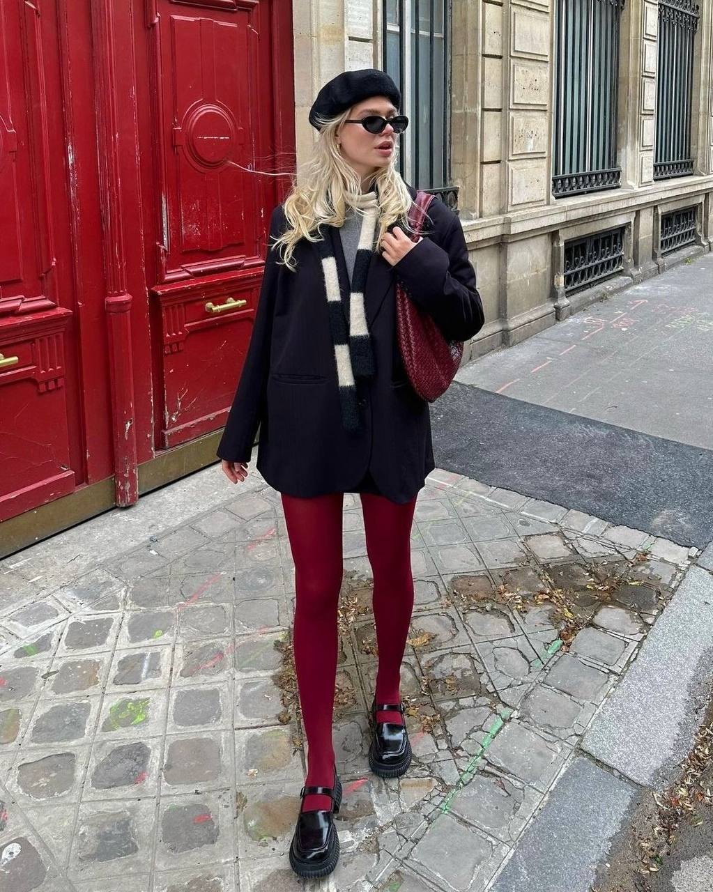 Бордовый или красный берет становится смелым цветовым акцентом в образе. Отлично сочетается с классическим клетчатым пиджаком и брюками с контрастными лампасами, создавая стиль, балансирующий между строгостью и игривостью.
