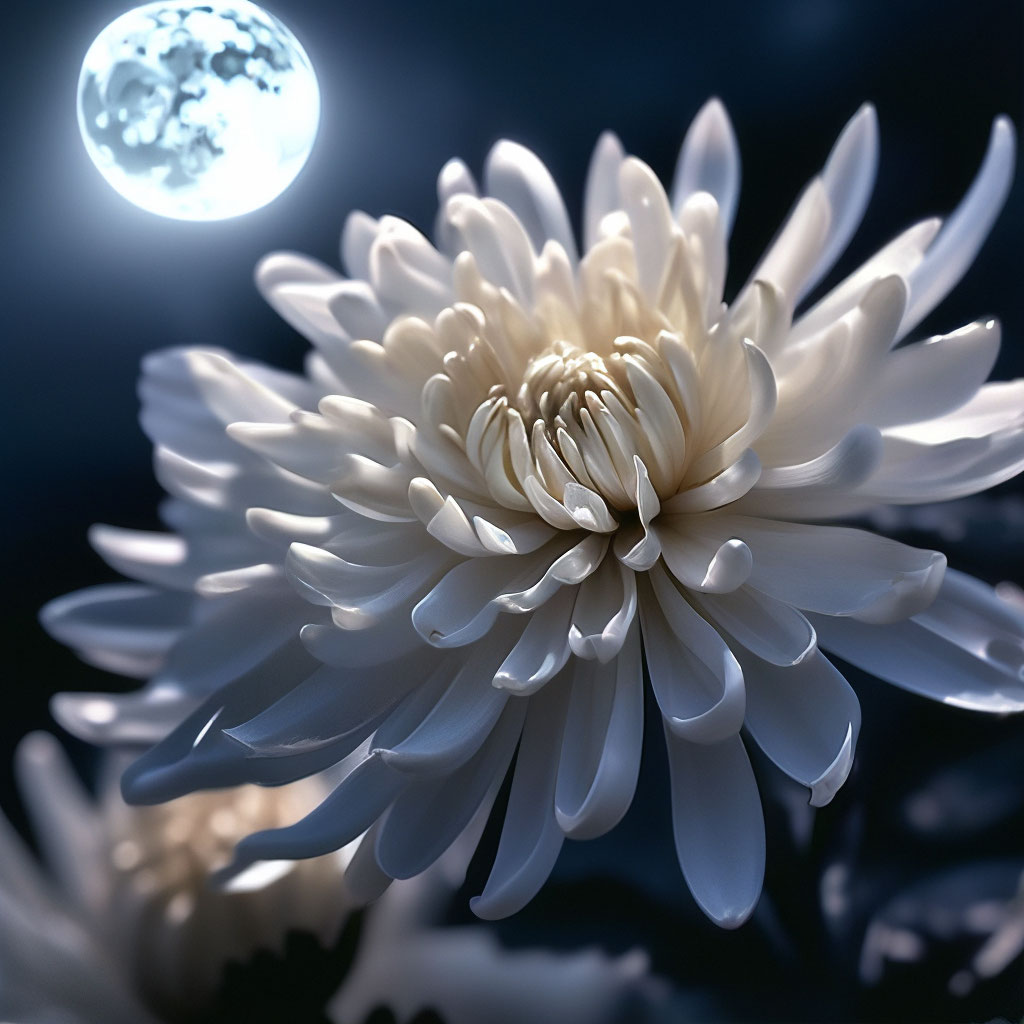 Согласно древней легенде, когда угасают яркие летние краски и небо затягивают осенние дожди, на землю приходит дитя Осенней Луны. Она обещала людям цветок, который станет символом продолжения жизни даже в пору увядания. Так в Поднебесной появилась благородная хризантема. «Любуйтесь ею и почитайте её, — сказала Луна. — Истинная красота не страшится испытаний и не ропщет на судьбу, она способна выжить под холодным ветром и тяжёлым снегом. Моя дочь щедро поделится с вами своей любовью к жизни, стоит лишь прикоснуться к её лепесткам и вдохнуть аромат уходящего сезона».